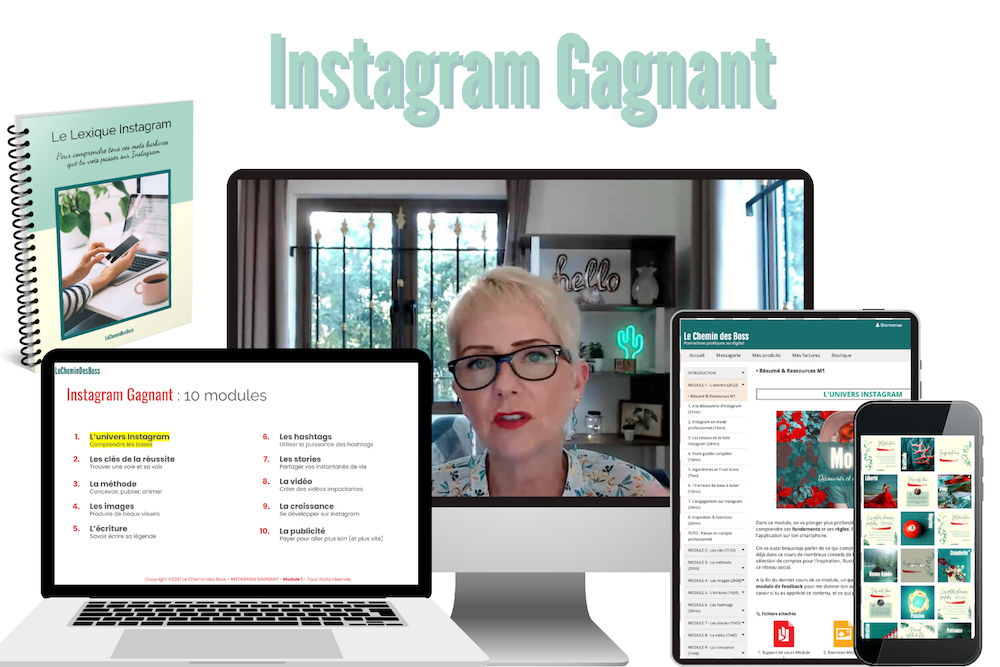 Les modules se suivent et sont organisés de manière logique pour que tu découvres Instagram petit à petit, sans risque de te perdre en route. Les exercices proposés sont conçus pour mettre en application immédiate ce que tu apprends et suivre tes progrès.